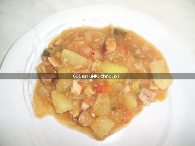 Cukinię obrać, wybrać miąższ z pestkami, pokroić w słupki lub w kostkę. Cebulę pokroić, chwileczkę podsmażyć i dodać pokrojoną w kostkę kiełbasę , paprykę, ogórek i razem smażyć. Do kiełbasy i warzyw dodać cukinię i dusić. Pod koniec dodać pomidory i przecier . Dusić jeszcze przez chwilę od czasu do czasu mieszając. Na koniec doprawić przyprawami.