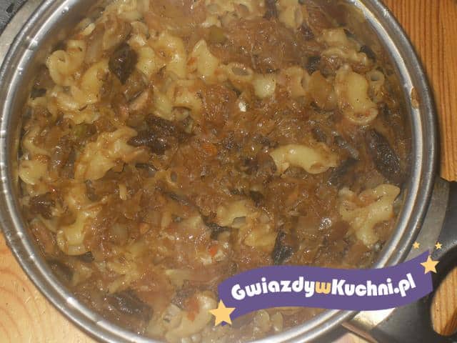 Kapustę podzielić na ćwiartki, ugotować, osączyć na sicie. Pieczarki umyć pod bieżącą wodą , osączyć, pokroić w cienkie plastry lub kostkę. Na rozgrzanej patelni roztopić 2 łyżki masła lub rozgrzać oliwę, wrzucić pieczarki, zwiększyć płomień palnika tak, by szybko odparował sok z pieczarek, następnie zmniejszyć ogień i podsmażyć pieczarki – ok. 5 minut. Drobno pokrojoną cebulę zrumienić na maśle (2 łyżki), dodać posiekaną kapustę, doprawić solą i pieprzem, dodać lekko podsmażone pieczarki i dusić razem około 15 min pod przykryciem. Makaron gotujemy w osolonej wodzie al’dente. Odcedzamy, mieszamy z masłem dodajemy kapustę z pieczarkami. Żaroodporny półmisek lub inne żaroodporne naczynie smarujemy masłem, przekładamy na niego łazanki obkładamy wiórkami – plasterkami masła i zapiekamy w piekarniku. Do kapusty można dodać ugotowane i pokrojone w paseczki lub kosteczkę grzyby być może zostały one z gotowania zupy grzybowej czy gołąbków.