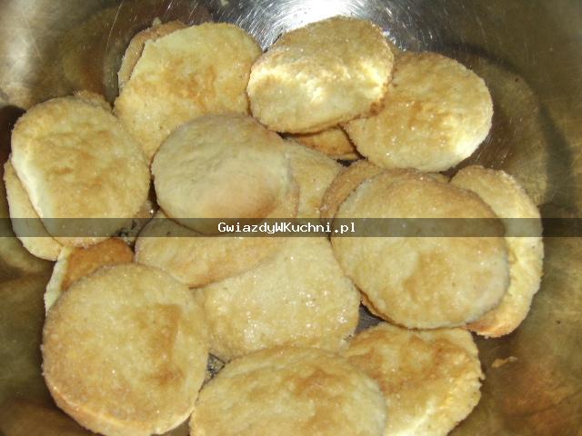 Mąkę siekamy z margaryną aż się dobrze połączy. Następnie dodajemy cukier i jeszcze chwilę siekamy. Dodajemy żółtka, śmietanę i amoniak. Wszystko dokładnie łączymy. Ugniatamy ciasto. Rozwałkować, a następnie szklanką lub foremkami wykrawać ciasteczka. Kłaść je jedną stroną na cukier i lekko przyciskać, aby cukier nie odpadł po upieczeniu. Ułożyć na blaszkę. Wstawić do piekarnika i upiec na jasno – złoty kolor.