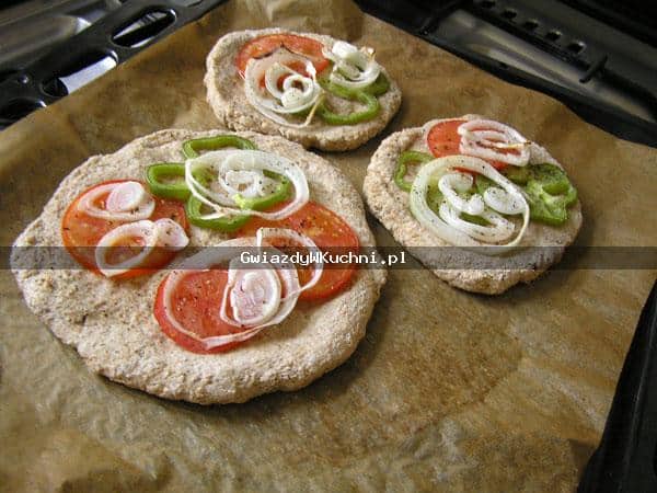 Wyrośnięte ciasto formujemy w placki wielkości dłoni, delikatnie rozciągamy. Układamy na papierze do pieczenia, a na pitach warzywa, solimy, pieprzymy i pieczemy 10 minut w piekarniku nagrzanym do 210 stopni.