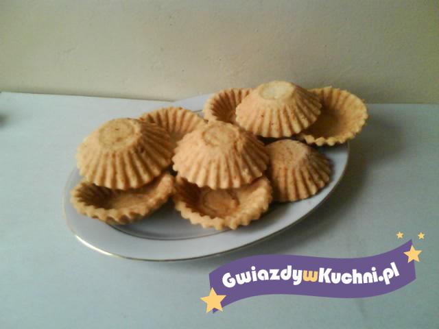 Do mąki dodajemy masło i siekamy, następnie dodajemy żółtka, cukier puder, cukier waniliowy, szczyptę soli i zagniatamy na jednolite ciasto. Foremki do babeczek natłuszczamy, stawiamy obok siebie. Ciasto rozwałkowujemy i na wałku przenosimy na foremki, na nich ciasto lekko wałkujemy i wciskamy do środka. Pieczemy około 15 minut w temperaturze 190 stopni.