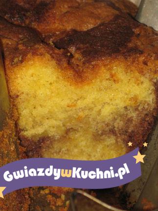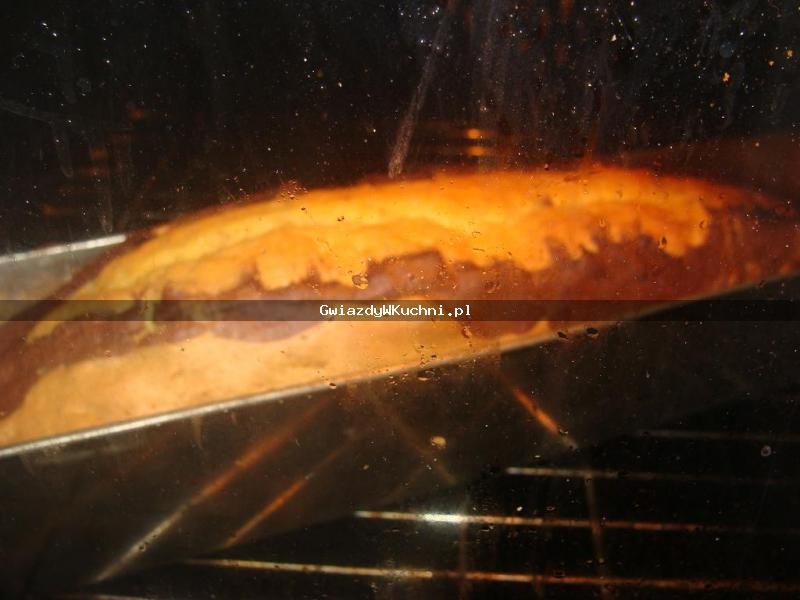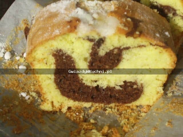 Masło roztapiamy i wystudzamy. Ucieramy żółtka z cukrem, dodajemy roztopiony tłuszcz, śmietanę i mąkę zmieszaną z proszkiem do pieczenia. Z białek ubijamy pianę i delikatnie łączymy ją z resztą składników. Masę dzielimy na połowę i do jednej części dodajemy przesiane kakao, mieszamy. Na spód formy wylewamy ciemną masę, a następnie jasną. Piec w temperaturze 180 stopni do godziny.