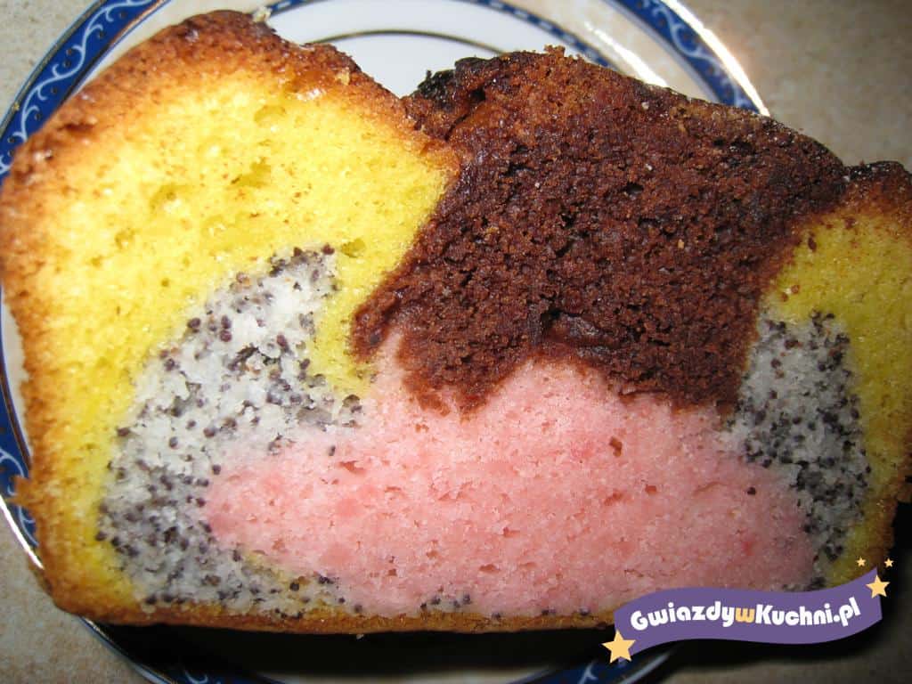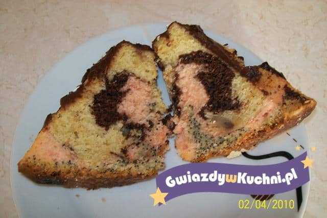 Ciasto układać na przemian porcjami w wąskiej foremce. Przed włożeniem do piekarnika surowe ciasto przekroić nożem wzdłuż blaszki. Piec ok. 50 min. w temp. 170°C.