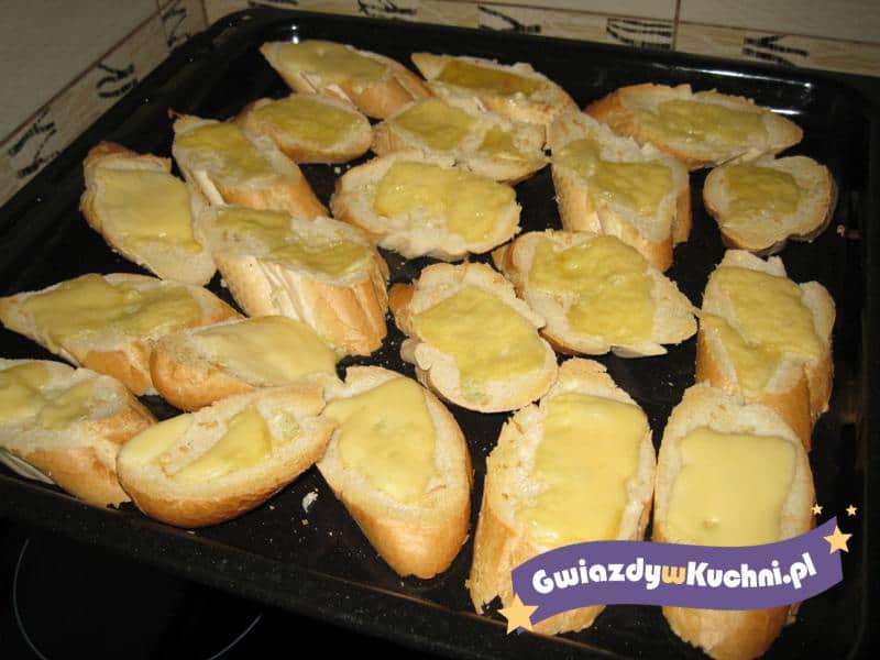 Pokroić bagietkę i natrzeć zmiażdżonym czosnkiem. Podpiec w piekarniku na złoty kolor. Na grzanki nałożyć plasterki sera żółtego, i jeszcze chwilkę podpiec.