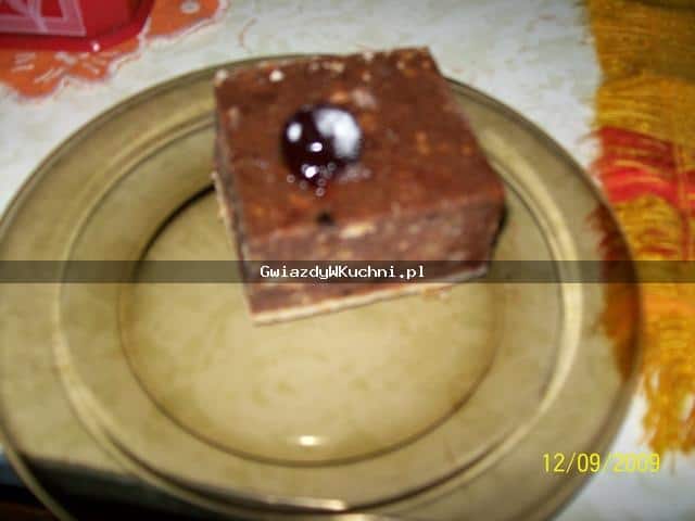 Z podanych składników zagniatamy ciasto, następnie dzielimy na 2 części i pieczemy 2 oddzielne placki. Placki pieczemy przez 15 minut w piekarniku nagrzanym do 180*C. Następnie po upieczeniu jeden placek jeszcze ciepły drobno kruszymy do miseczki. Następnie dodajemy orzechy, rodzynki, kakao i mleko. Całość dokładnie wyrabiamy na jednolitą masę. Następnie masę wykładamy na drugi upieczony placek. Przygotowujemy polewę: wszystkie składniki na polewę rozpuszczamy w garnku, dodajemy kakao i mieszamy dokładnie, aby nie było grudek. Ciasto polewamy polewą. Dekorujemy wisienkami koktajlowymi.