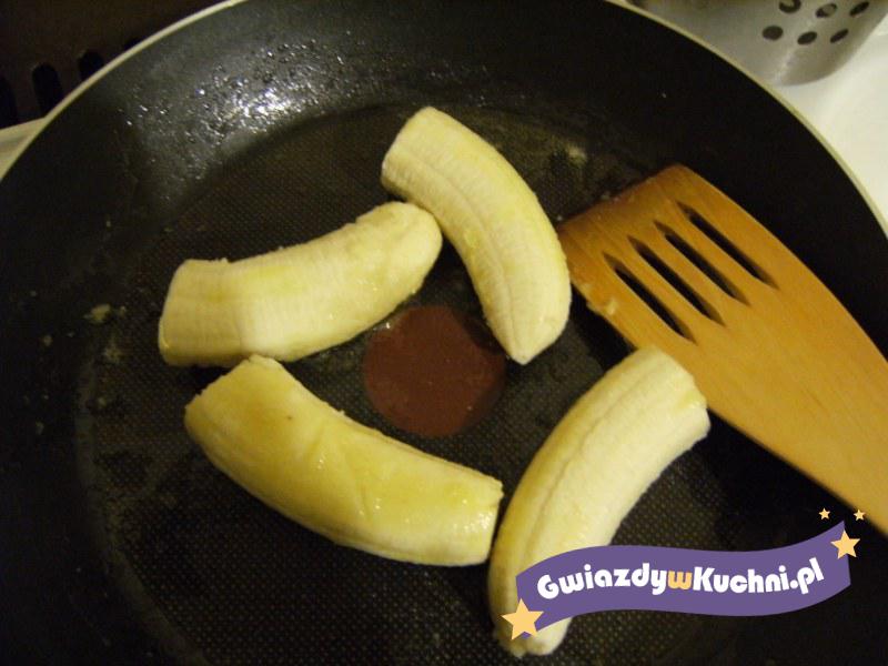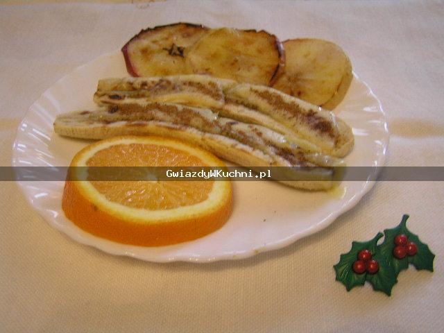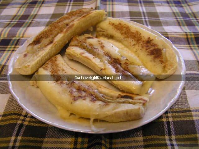 Przekrojone wzdłuż na pół banany usmażyć na maśle. Ułożyć w naczyniu żaroodpornym, przykryć plastrami sera. Posypać cukrem i cynamonem. Zapiekać w gorącym piekarniku, aż ser rozpuści się.
