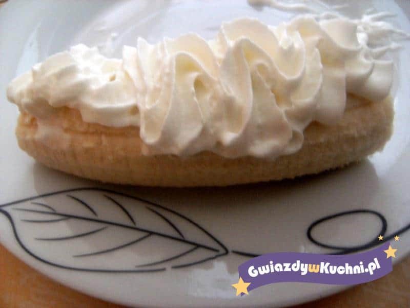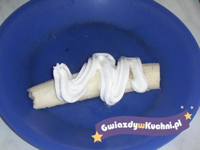 Wino zagotować z cukrem i wanilią. Banany obrać, pokroić w paski, zalać winem i pozostawić w chłodnym miejscu na 2 godziny. Następnie nałożyć do szklaneczek, udekorować bitą śmietaną z cukrem i poziomkami.