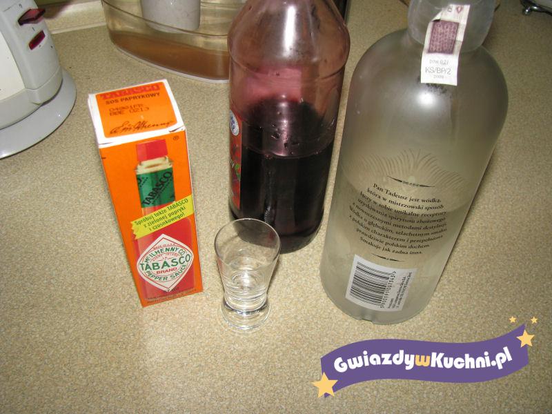 Wlać wódkę do kieliszka ale nie do końca uzupełnić wódkę sokiem malinowym wlewając po brzegu . Dodać kilka kropel tabasco.
