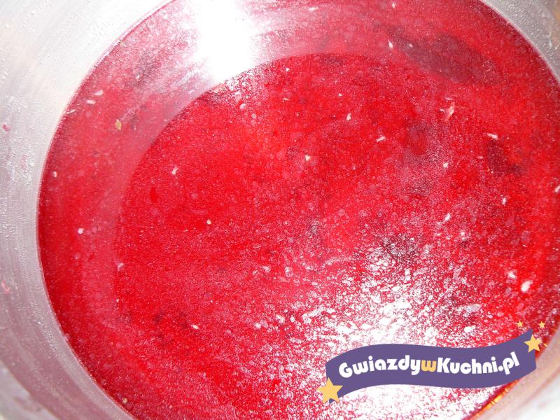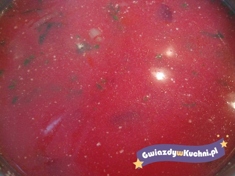 Do gotującego się wywaru wlewamy kwas buraczany, mieszamy aż do zagotowania. Doprawiamy solą, pieprzem i wrzucamy przeciśnięty czosnek.
