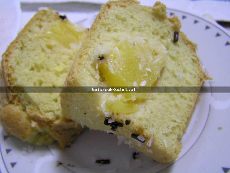 żółtka oddzielić od białek . Z białek zrobić pianę, dodać cukier i cukier waniliowy, razem ubić, dodać żółtka i cały czas ubijając. Wsypać mąkę przesianą przez sito z proszkiem do pieczenia i dokładni zmiksować. Na końcu wlać olej, wszystko razem ubić. Krążki ananasa pociąć na kawałki. Masę przelać do tortownicy wyłożonej papierem do pieczenia, powkładać kawałki ananasem. Piec 40 minut w 180 stopniach.