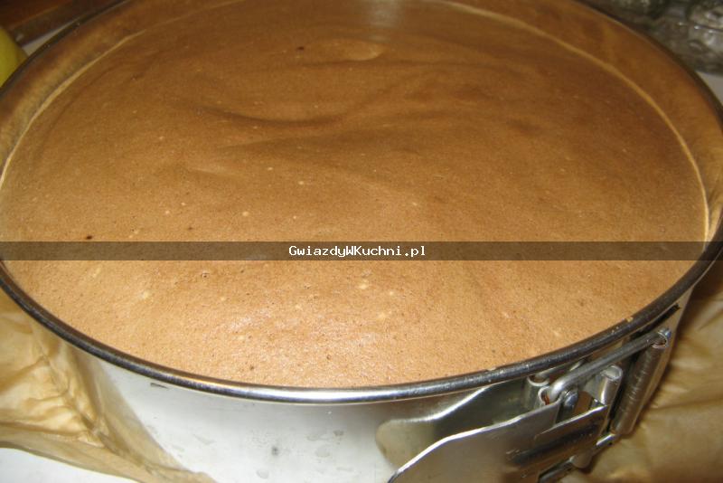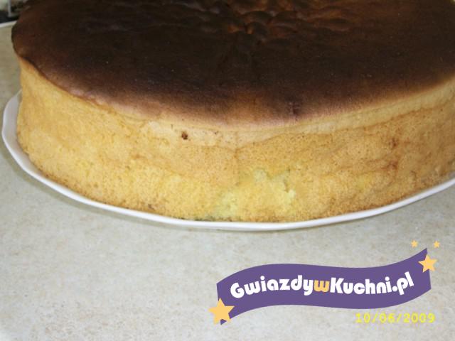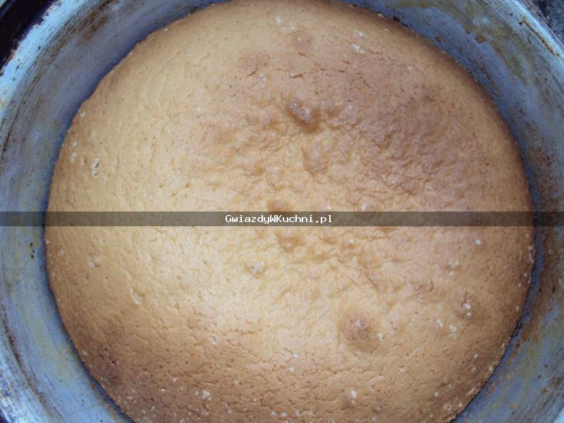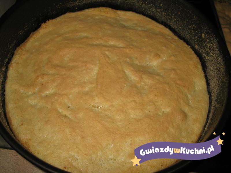 Białka ubijamy z cukrem na sztywną pianę. Następnie dodajemy po żółtku. Mąkę mieszamy z proszkiem do pieczenia. Mąkę wymieszaną wsypujemy po 1 łyżce do żółtek, ciągle miksujemy. Pieczemy 40 minut w 180 stopniach.