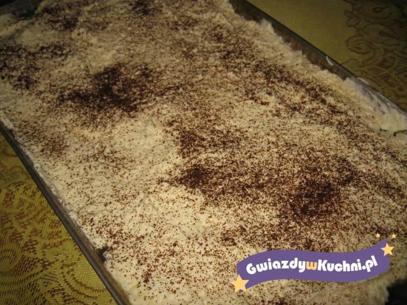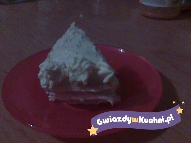 Biszkopt przekroić na pół. Krem przyrządzić według przepisu na opakowaniu. Podzielić go na części, jedna powinna być większa. Większą część kremu położyć na biszkopt, na to przyłożyć drugą część biszkoptu. Pozostały krem wyłożyć na wierzch, na to można położyć owoce lub polewę.