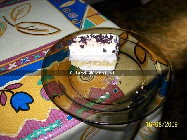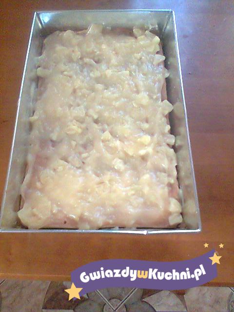 biszkopt – masa ananasowa – druga część biszkoptu – masa śmietanowa – wierzch posypać wiórkami czekoladowymi lub posypać kawałkami czekolady.