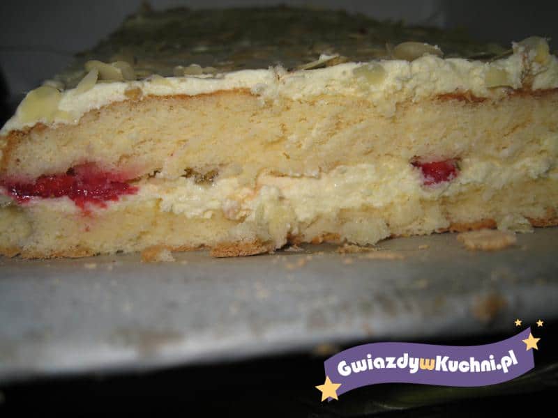 Białka oddzielić od żółtek. Białka ubić na sztywną pianę, dodać cukier i żółtka. Następnie dodać mąkę i proszek do pieczenia, dokładnie wszystko razem wymieszać. Wylać ciasto na formę do pieczenia i piec około 40 minut w temp. 180*C. Po upieczeniu biszkopt ostudzić i przekroić na pół.