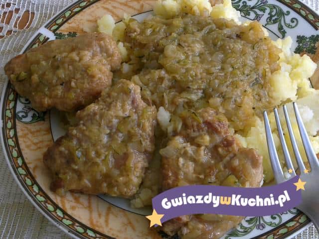 Szynkę pokroić na plastry, posolić, popieprzyć i obtoczyć w mące. Obsmażyć na rumiano z obu stron i przełożyć na półmisek (można okryć folią aluminiową, aby nie wystygły). Na tłuszczu ze smażenia mięsa zeszklić posiekaną cebulę. Dodać starką na dużych oczkach cukinię, chwilę smażyć i ułożyć kotlety. Podlać gorąca wodą tyle, aby były zakryte. Przyprawić solą, pieprzem i dusić pod przykryciem do miękkości.