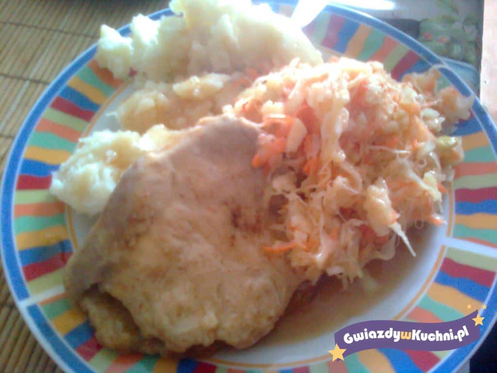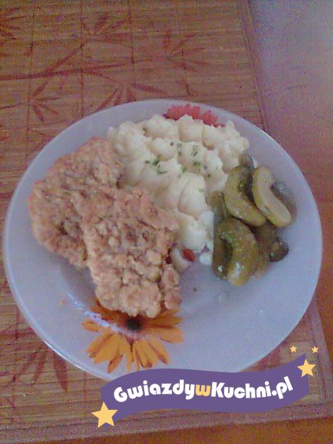 Schab kroimy na 4 części, rozbijamy, obsypujemy przyprawami. Obtaczamy najpierw w mące, jajku i znów w bułce. Smażymy na oleju. Owijamy w folię aluminiową z odrobiną masła i wkładamy do brytfanki i do piekarnika na 15 min w temp 200 stopni.