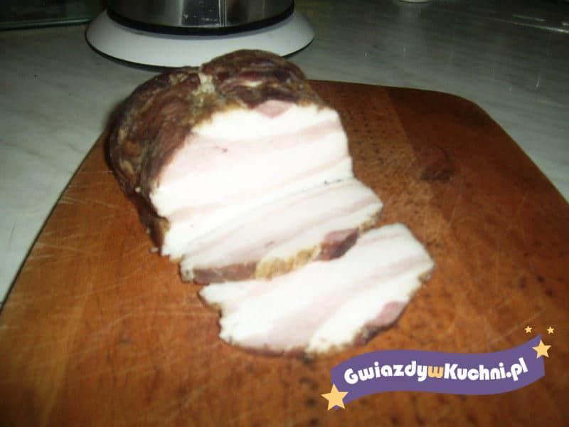 Co 2 dni przewracamy. Boczek płuczemy i osuszamy. Oprószamy pieprzem i majerankiem. Zwijamy i obwiązujemy. Pieczemy ok 1,5 godz. w 170 stopniach Usuwamy sznurek i kroimy w plastry.