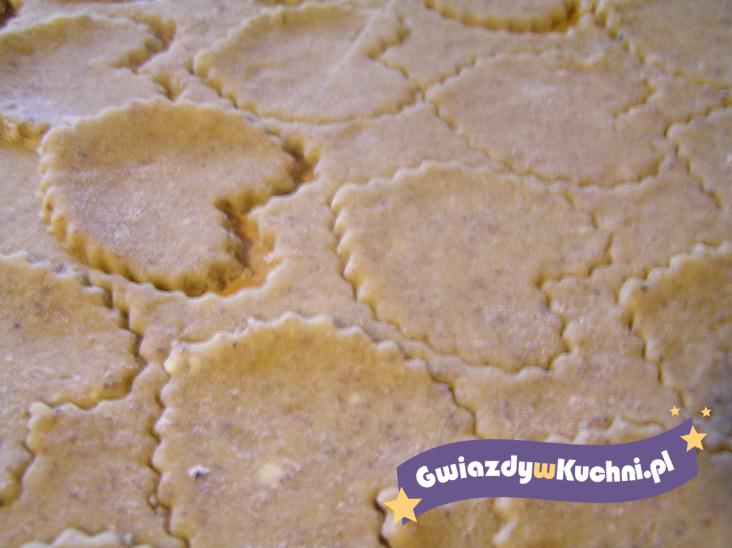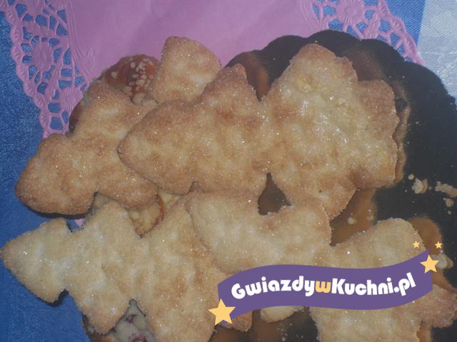 Na stolnicy wymieszać mąkę (1 -2 łyżki odłożyć) z 6 dag cukru pudru, solą i skórką pomarańczy, dodać jajko. Masło posiekać na drobne kawałki, rozłożyć na mące. Szybko zagnieść kruche ciasto, zawinąć w folię i włożyć na 1 godzinę do lodówki. Na oproszonej mąką stolnicy rozwałkować ciasto na grubość 3-4 mm i foremką wyciąć choinki, posypać cukrem. Ciasteczka ułożyć na natłuszczonej blasze, wstawić do piekarnika i piec 8-10 minut w temperaturze 175 stopni c. Na złotożółty kolor. Ciasteczka zdjąć z blachy i pozostawić do ostygnięcia.