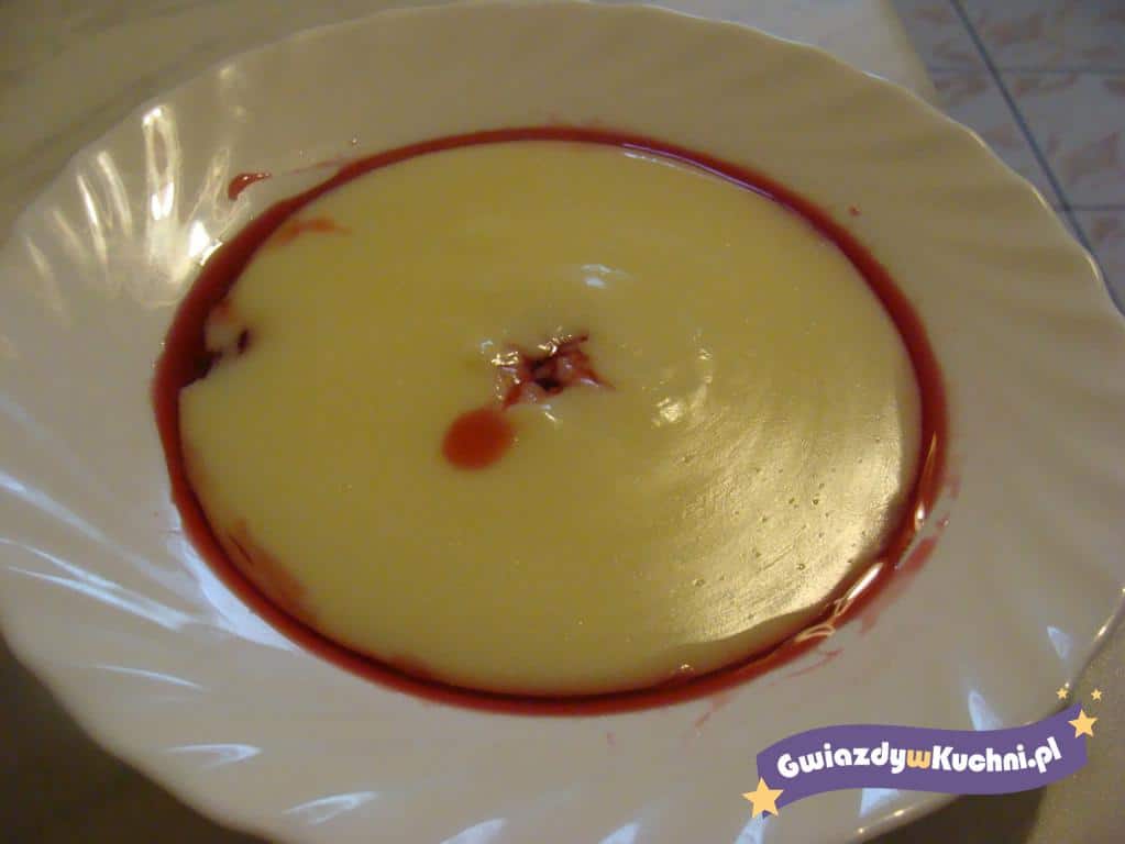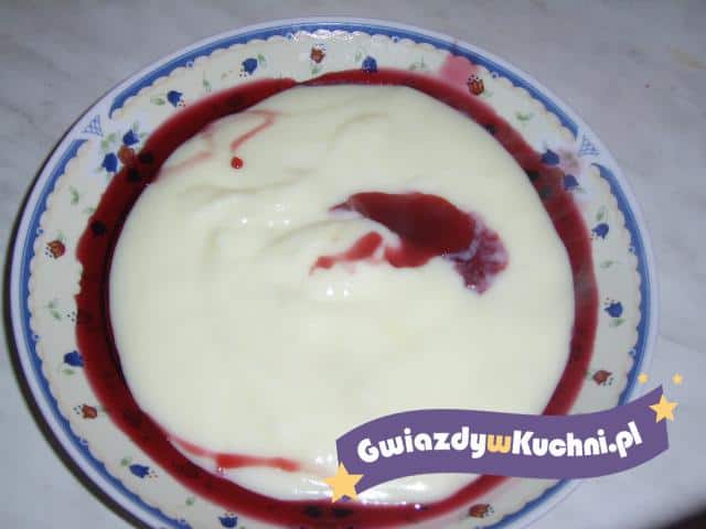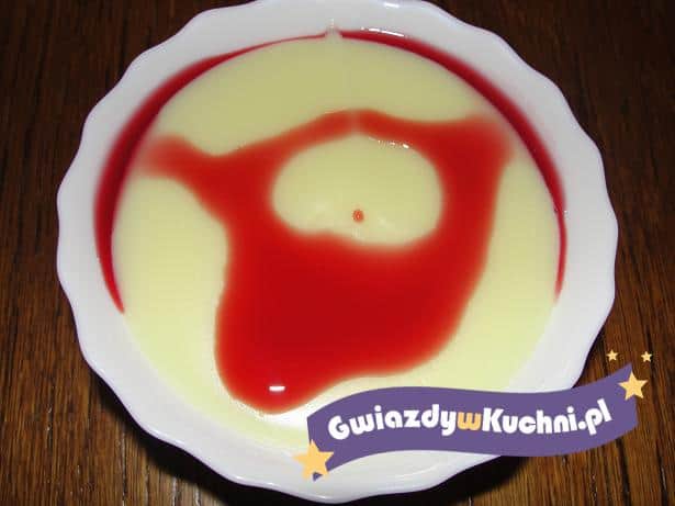 Budyń przygotować według przepisu na opakowaniu i wlać do salaterek. Budyń polać dowolnym sokiem.