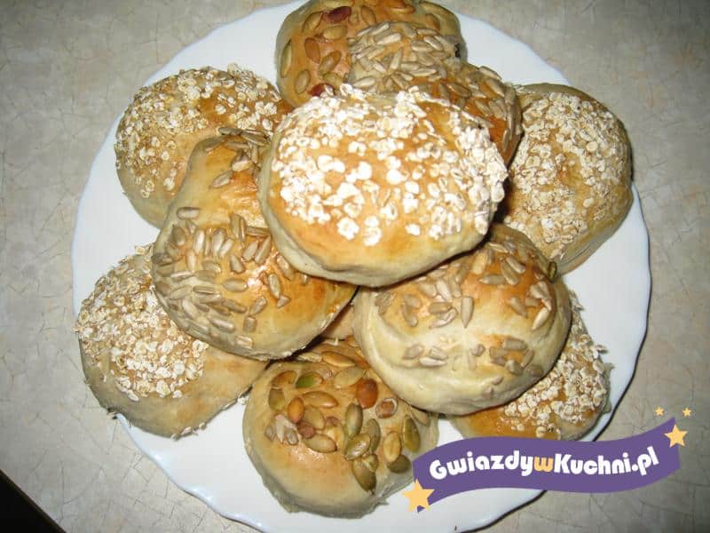 Drożdże mieszamy z łyżką miodu i mlekiem, roztrzepujemy. Wsypujemy mąkę owsianą, mieszamy i odstawiamy na godzinę. Następnie dodajemy sól i mąkę pszenną, zagniatamy ciasto. Ponownie odstawiamy i jeszcze raz wyrabiamy. Formujemy bułeczki, układamy na posmarowanej tłuszczem blasze, posypujemy płatkami owsianymi wierzch bułeczek. Zostawiamy w ciepłym miejscu 15 minut. Bułeczki pieczemy 20 minut w 220 stopniach.