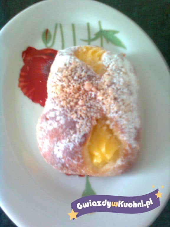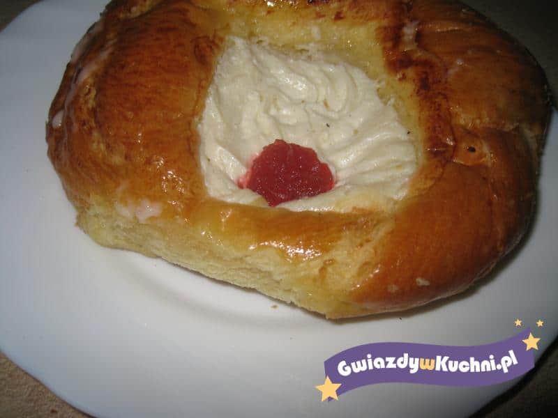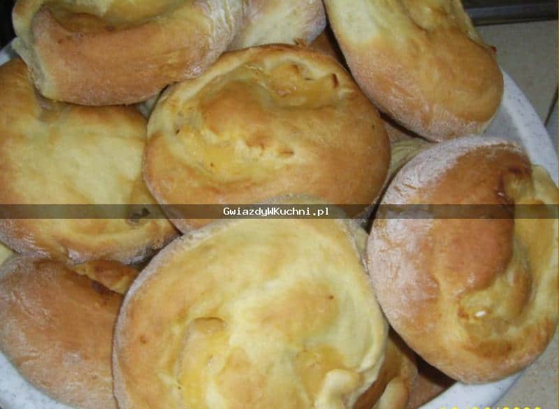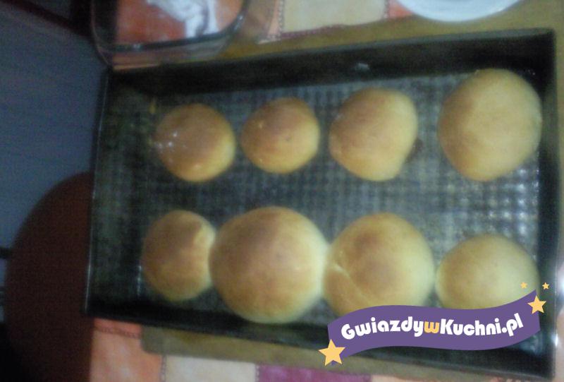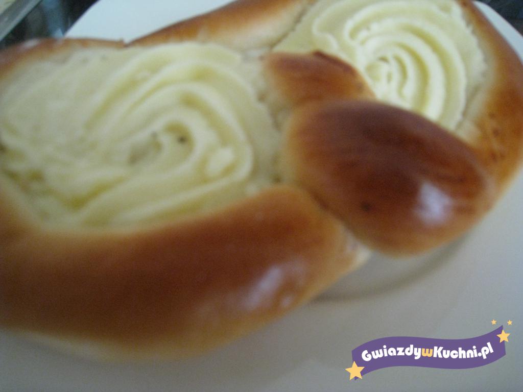 Na każdej rozsmarować budyń i zwinąć. Powstałe w ten sposób rolady pokroić na plastry o grubości około 2 cm. Bułeczki układać na blasze i posmarować żółtkiem.