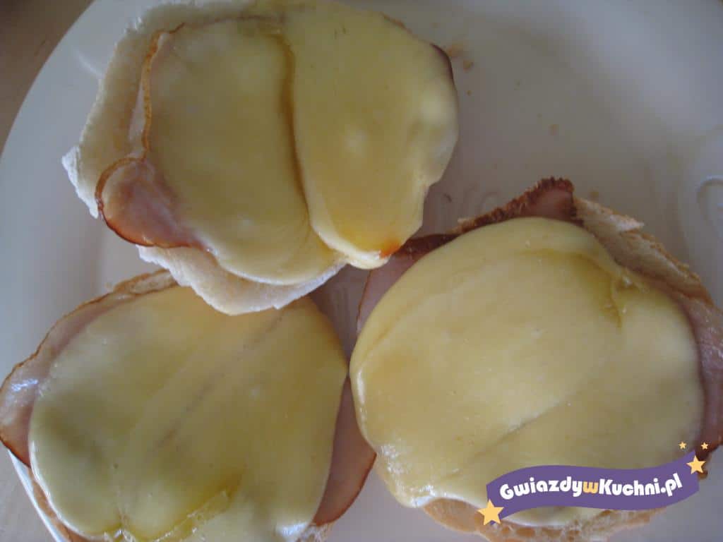 Bułki posmarować masłem. Na każdą połóżyć plaster szynki i sera. Następnie bułki zapiekać w piekarniku w temperaturze 160 stopni do momentu, aż ser się rozpuści.