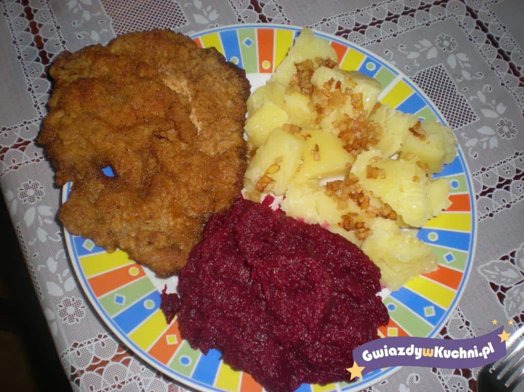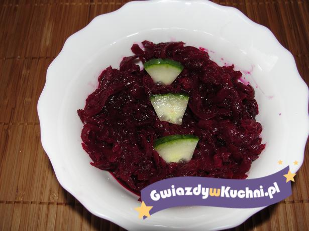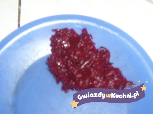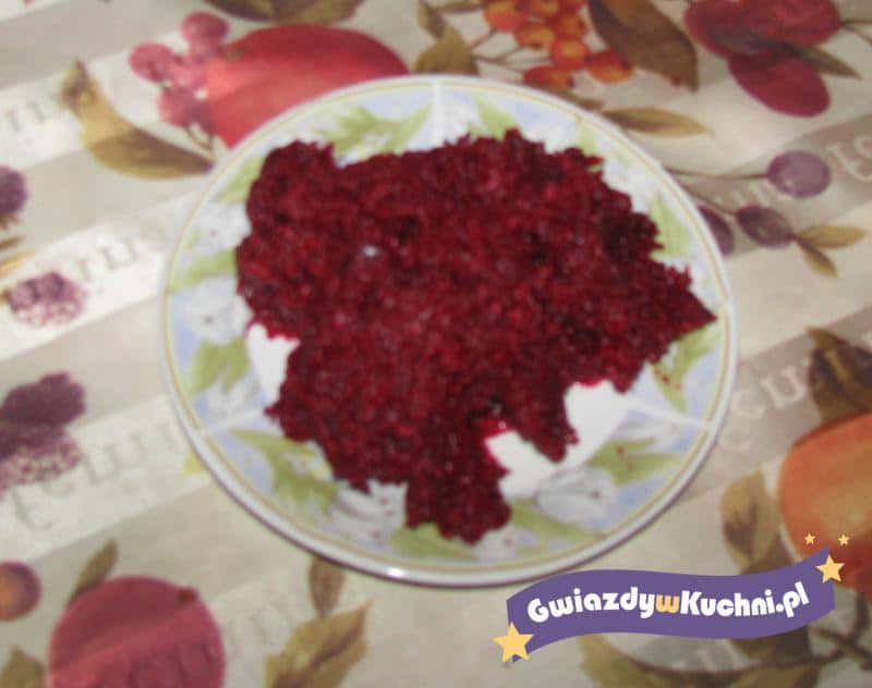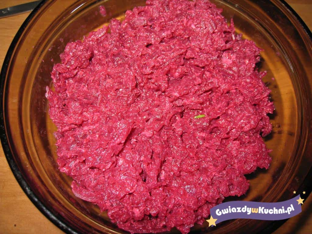 Buraczki oczyszczamy, gotujemy, następnie odstawiamy do przestudzenia. Po przestudzeniu buraki obieramy ze skórki i ścieramy na tarce o małych oczkach. Następnie dodajemy sól oraz pieprz do smaku, dokładnie mieszamy.