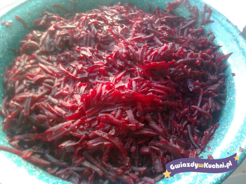 Buraczki gotujemy do miękkości z liśćmi laurowymi. Odcedzamy, studzimy. Buraczki obieramy i ścieramy na tarce o dużych oczkach. Dodajemy do smaku ocet jabłkowy, odrobinę cukru i soli. Jeśli buraczki puszczają mało soku możemy dodać troszkę przegotowanej letniej wody. Buraczki przekładamy do słoików i pasteryzujemy ok. 15-20 min.