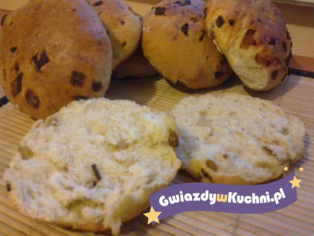 Cebulę obrać, pokroić na większą kostkę i uprażyć na oliwie z odrobiną cukru. Drożdże i cukier rozpuścić w ciepłej wodzie-odstawić na chwilkę. Mąkę przesiać do miski wymieszać z solą, dodać resztę składników razem z drożdżami i ostudzoną cebulą zagnieść na gładkie ciasto. Na blasze posypanej mąką układać uformowane bułeczki i pozostawić do wyrośnięcia. Pieczemy w nagrzanym piekarniku 160 stopni przez ok. 20 minut. Dwie minuty przed końcem pieczenia spryskać zimna woda, aby skórka była bardziej chrupiąca.