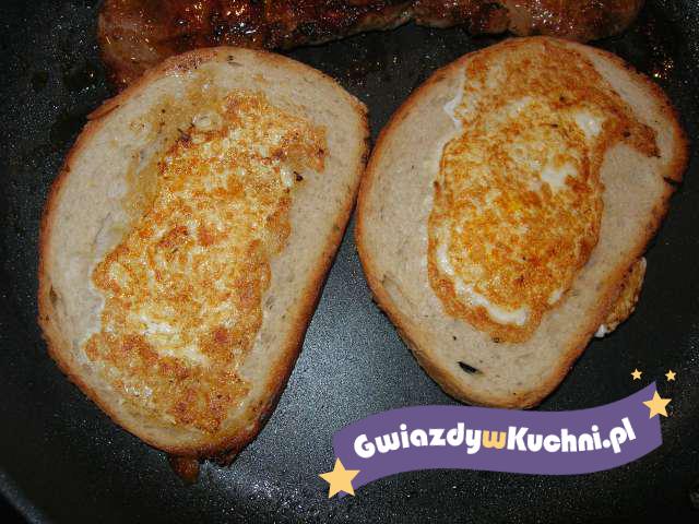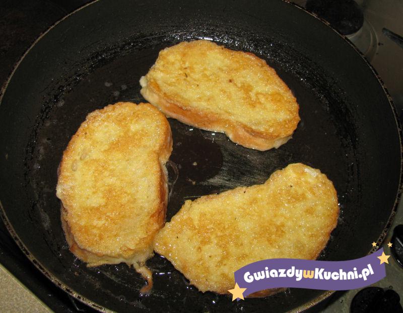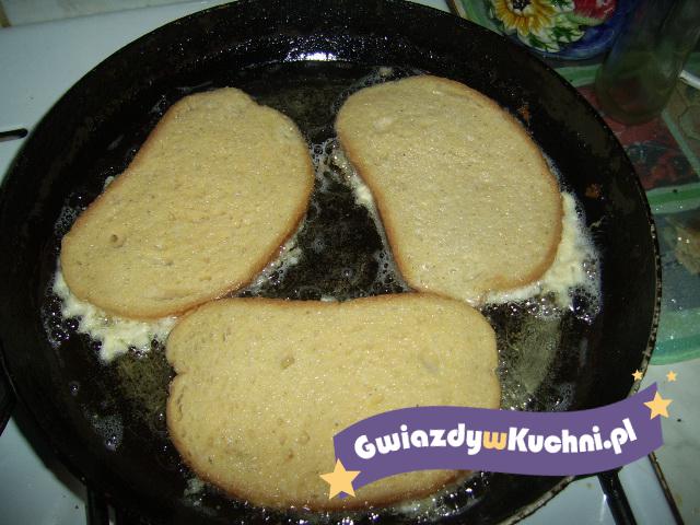 Chleb obtaczać w roztrzepanym jajku, smażyć z obu stron. Na talerzyku posypać startym serem, odrobinkę posolić.