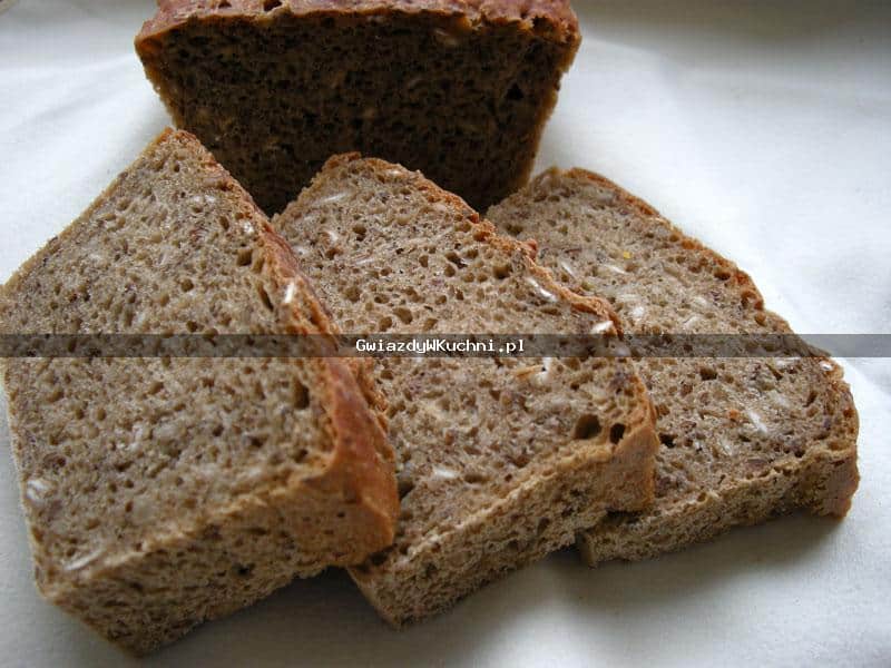 Drożdże rozprowadzić z cukrem i połową szklanki ciepłej wody. Przykryć ściereczką i odstawić w ciepłe miejsce do wyrośnięcia. Pozostałe składniki dokładnie wymieszać, dodać wyrośnięte drożdże. Natłuścić formę, obsypać mąką i przełożyć masę chlebową. Piec w temperaturze 180 stopni, przez godzinę. Przed wyjęciem sprawdzić patyczkiem, czy chleb jest upieczony.