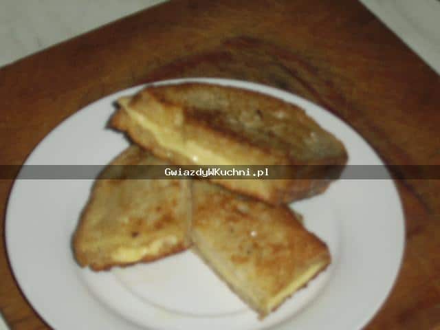 Na kromkę chleba położyć plasterek sera i przykryć drugą kromka. Jajka roztrzepać, dodać soli i pieprzu. Kromki chleba moczymy w jajku i smażymy na rozgrzanym tłuszczu, z obu stron.