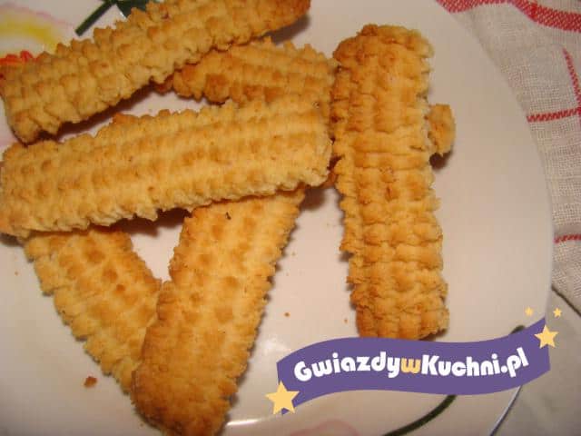 Wyrobić ciasto z podanych składników. Założyć na maszynkę do mięsa specjalną blaszkę – formę z otworami i przepuścić ciasto. Wychodzące paski krajać na dowolnej długości ciastka. Układać na blasze i piec około 25-30 minut, przez 150 stopni c.
