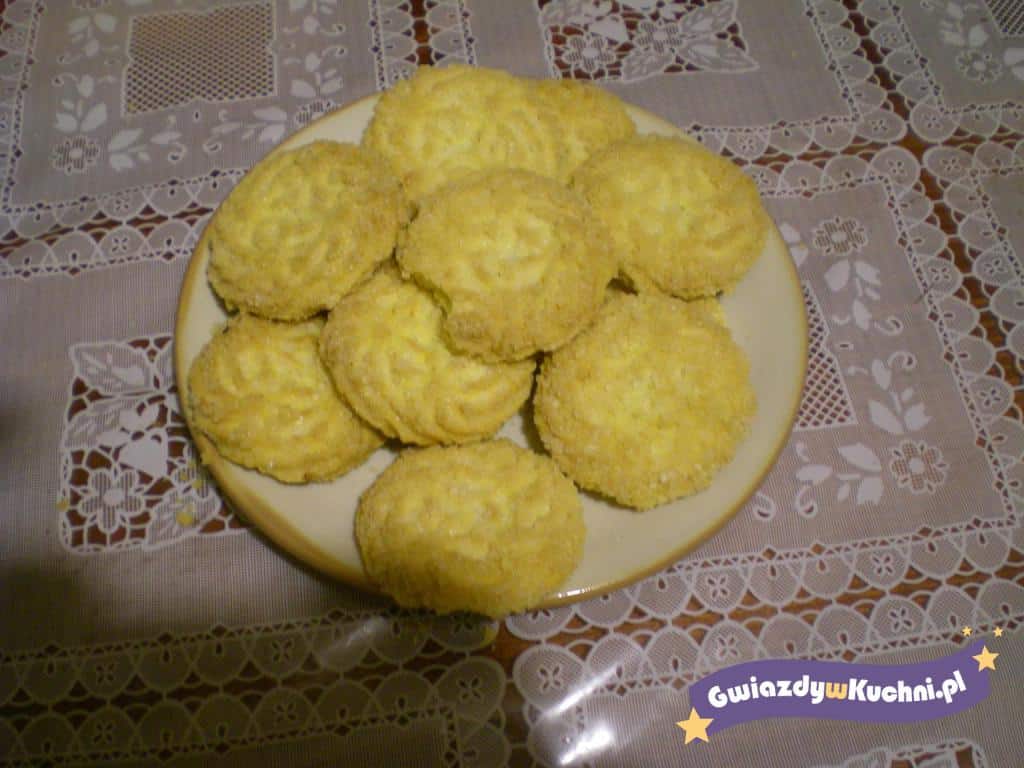 Składniki ciasteczek połącz razem na ciasto. Schłodź w lodówce 2 godziny. Po tym czasie ciasto rozwałkuj i wycinaj ciasteczka foremkami. Ułóż na papierze do pieczenia, posmaruj rozmąconym jajkiem i posyp cukrem. Piecz na rumiano.