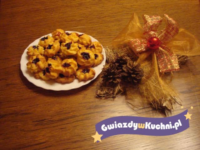 Ugotowane na wodzie żółtka zetrzeć na drobnym tarle. Wszystkie składniki zagnieść dodać żółtka. Wyciskać szprycką ciasteczka ozdobić marmoladą. Piec 10-15 min w 160 st.