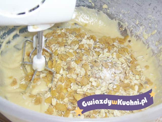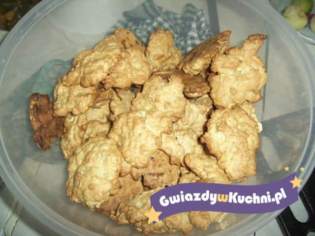 Jajka ubić z cukrem i cukrem waniliowym. Mąkę wymieszać z proszkiem do pieczenia i delikatnie wsypywać do ubitych jajek. Dodać roztopioną zimną margarynę. Na końcu do ciasta wsypać musli i wymieszać. Z ciasto formować małe placuszki i kłaść na wysmarowaną blaszkę. Piec około 15-20 minut w 180* na złoty kolor.