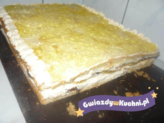 Ciasto przekroić na pół. Dać na to trochę masy, na to dać biszkopty, wylać na to galaretkę z 1 opakowania. Poczekać aż stężeje, następnie na to dać masę, przykryć drugą częścią ciasta. Następnie posmarować masą i ozdobić nią mąki. Tak przygotowany placek zalać tężejącą galaretką.