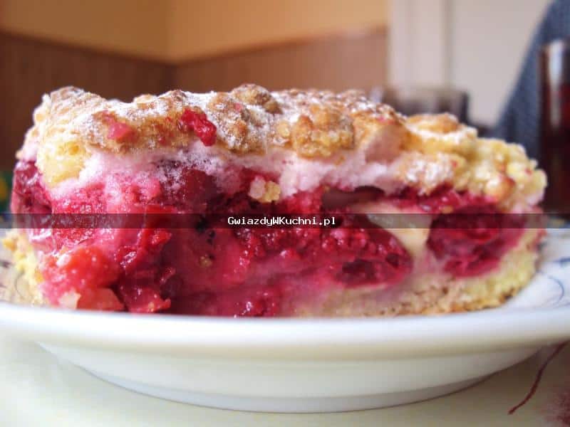 Margarynę, mąkę, żółtka, cukier mieszamy i wyrabiamy ciasto. Wykładamy do blaszki na to układamy maliny, a na koniec polewamy ubitą pianę z białek. Piec 40 minut w temperaturze 170 stopni.