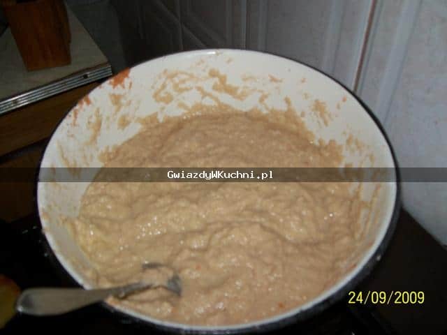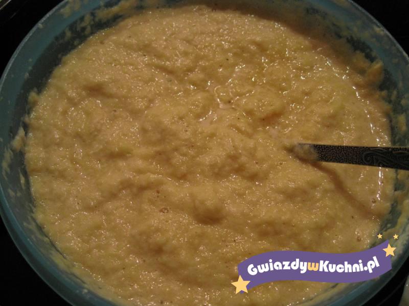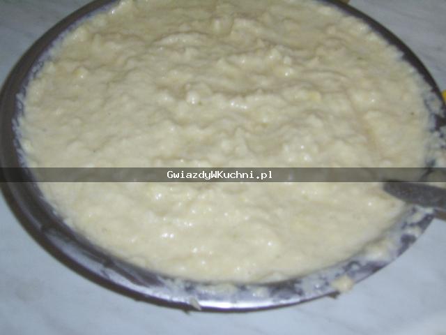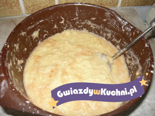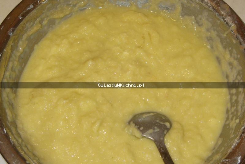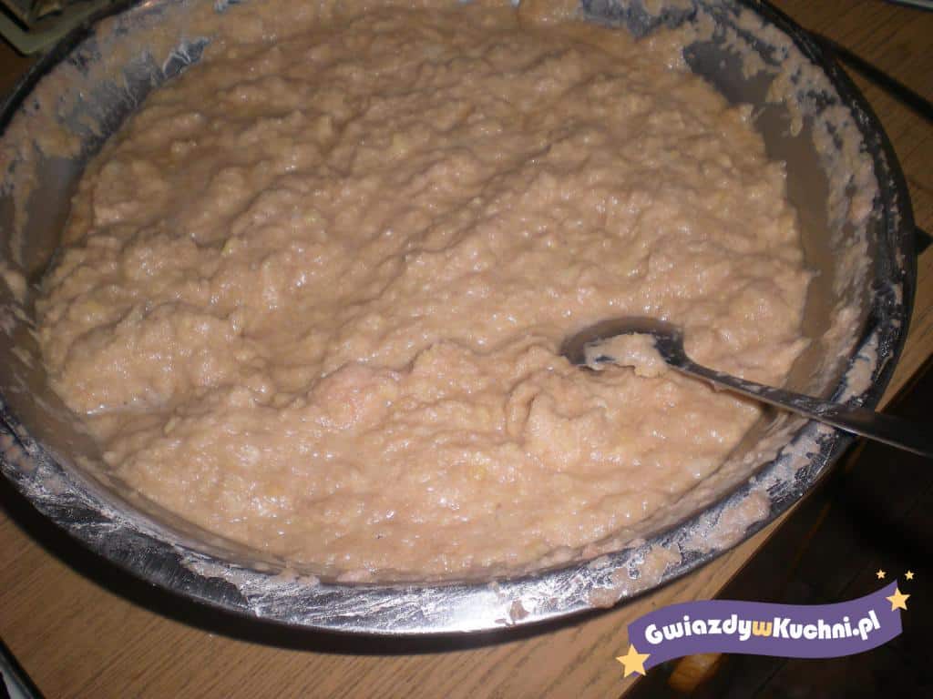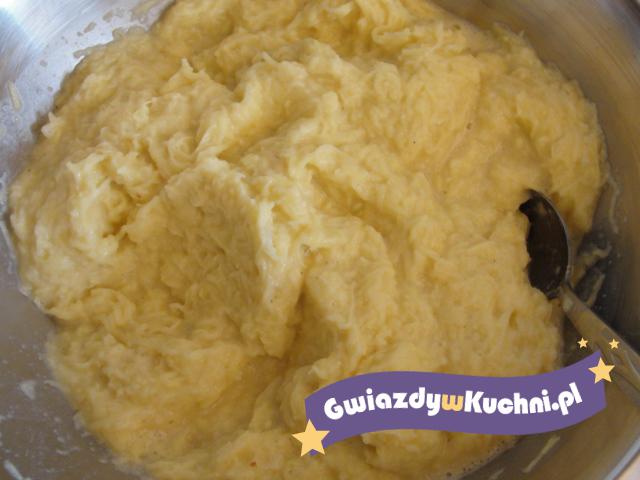 Ziemniaki obieramy, myjemy i ścieramy na tarce. Następnie dodajemy mąkę, ma być jej tyle, żeby ciasto nie było ani zbyt gęste, ani zbyt rzadkie. Następnie solimy oraz pieprzymy do smaku, wszystko dokładnie mieszamy ze sobą.
