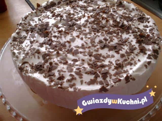 Galaretkę rozpuścić w 1 szklance gorącej przegotowanej wody i odstawić do lekkiego stężenia w chłodne miejsce. Schłodzone mleko ubić z cukrem waniliowym, bitą śmietaną w proszku i połączyć z gęstniejącą galaretką. Na paterze położyć blat biszkoptowy o śr. 26 cm założyć obręcz i wlać na biszkopt pianko-galaretkę. Wierzch posypać płatkami czekolady i włożyć do lodówki aby stężało. Smacznego!