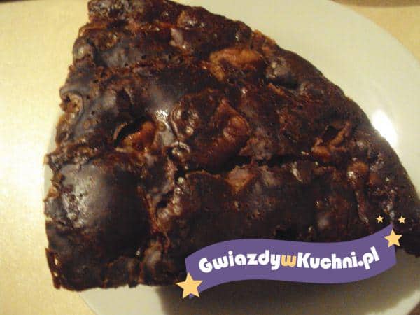 Jajka utrzeć z cukrem. Dodać olej, mąkę pszenną, cynamon, sodę, kakao i proszek do pieczenia. Zmiksować na jednolitą masę. Do masy dodać jabłka pokrojone w kostkę i wymieszać. Przelać masę do formy wysmarowanej masłem i obsypanej bułką tartą. Piec przez ok. 1h w temperaturze 180 stopni.