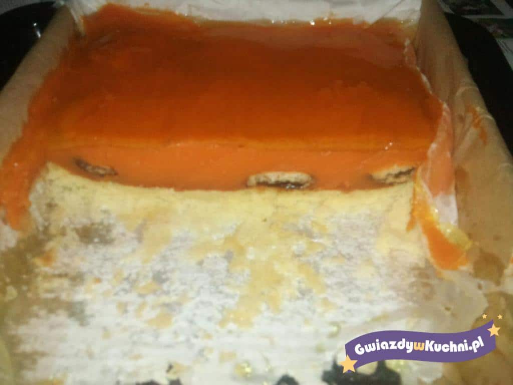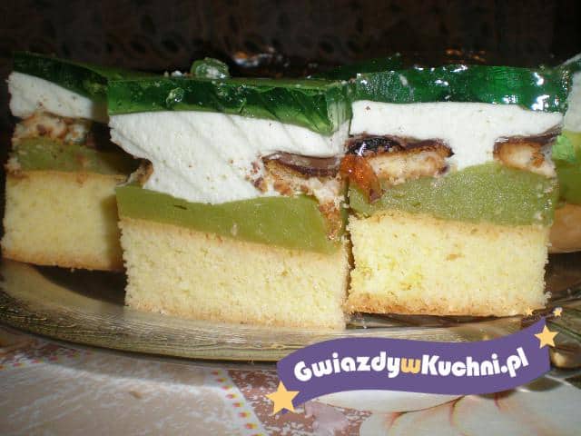Białka oddzielić od żółtek. Białka ubić dodając cukier pod koniec ubijania. Następnie wymieszać z żółtkami, aromatem i olejem. Następnie dodawać mąkę cały czas mieszając. Ciasto piec przez około 25- 30 minut w piekarniku nagrzanym do temperatury 180 stopni. Budynie należy rozpuścić w 1 szklance soku, resztę soku zagotować, następnie dodać budynie i raz jeszcze zagotować. Gorącą masę rozprowadzić na cieście, na masie ułożyć delicje. Galaretkę należy rozpuścić w 3/4 szklanki wody i zostawić do przestudzenia. Śmietanę ubić, pod koniec ubijania dodać rozpuszczoną i przestudzoną galaretkę. Masę wylać na delicje. Dwie galaretki rozpuścić w wodzie i pozostawić do lekkiego stężenia i wylać je na masę śmietanową, odstawić do lodówki w celu całkowitego stężenia.