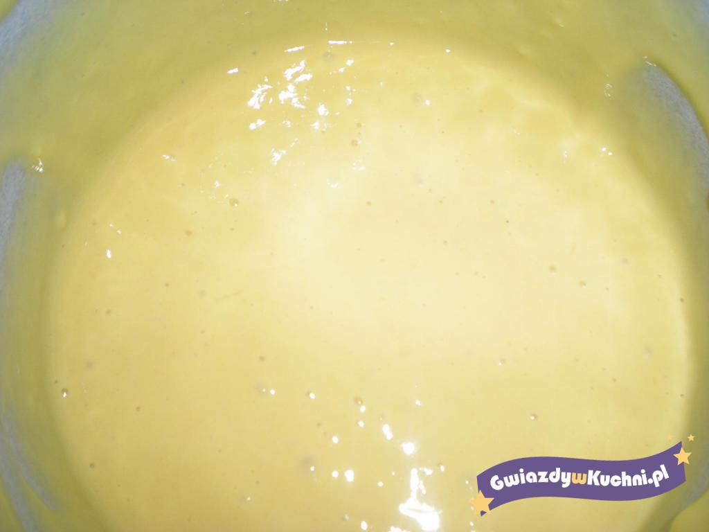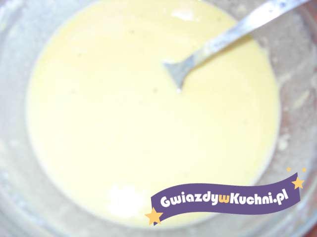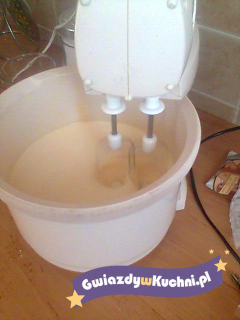 2. Dalej ubijać, stopniowo dodając cukier, po 1 żółtku, olej oraz mąkę z proszkiem.