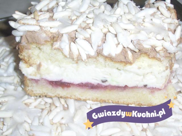 Biszkopt– białka ubijamy mikserem na sztywną pianę. Pod koniec ubijania dodajemy cukier, cukier waniliowy, a następnie żółtka. Mąkę mieszamy proszkiem do pieczenia. Małymi porcjami dodajemy do masy jajecznej, delikatnie mieszamy łyżką. Wylewamy surowe ciasto na dużą formę prostokątną o wym. 28x40cm. Pieczemy w temp. 180°c ok. 40 minut. Po ostudzeniu przekroić wzdłuż na 2 części. Masa orzechowa –kawę rozpuszczamy w niewielkiej ilości wody. Masło ucieramy z cukrem pudrem za pomocą miksera, dodajemy orzechy, nutellę i ostudzony napar kawy. Całość dokładnie miksujemy. Masa śmietankowa –śmietanę ubijamy na sztywno. Pod koniec dodajemy cukier puder. Żelatynę zalewamy zimną wodą. Po napęcznieniu dodajemy wrzątek i rozpuszczamy żelatynę dokładnie mieszając. Lekko przestudzoną wlewamy powoli do śmietany i delikatnie miksujemy do równomiernego jej rozprowadzenia. Rozkruszone bezy mieszamy z rozdrobnioną czekoladą i dodajemy porcjami do śmietany. Wykonanie ciasta– jedną połowę biszkopta smarujemy dżemem wiśniowym. Na to wykładamy całość masy śmietankowej. Przykrywamy drugą połową biszkopta. Smarujemy masą orzechową i obsypujemy ryżem preparowanym. Wierzch polewamy gotowym lukrem cytrynowym.