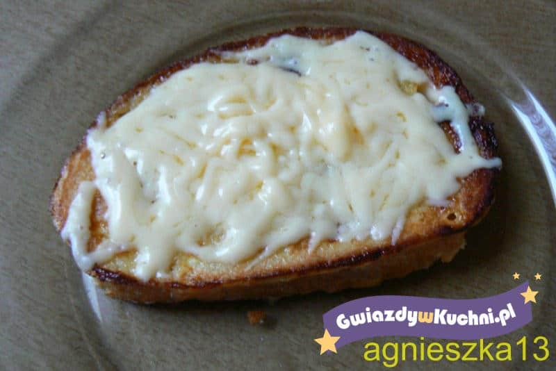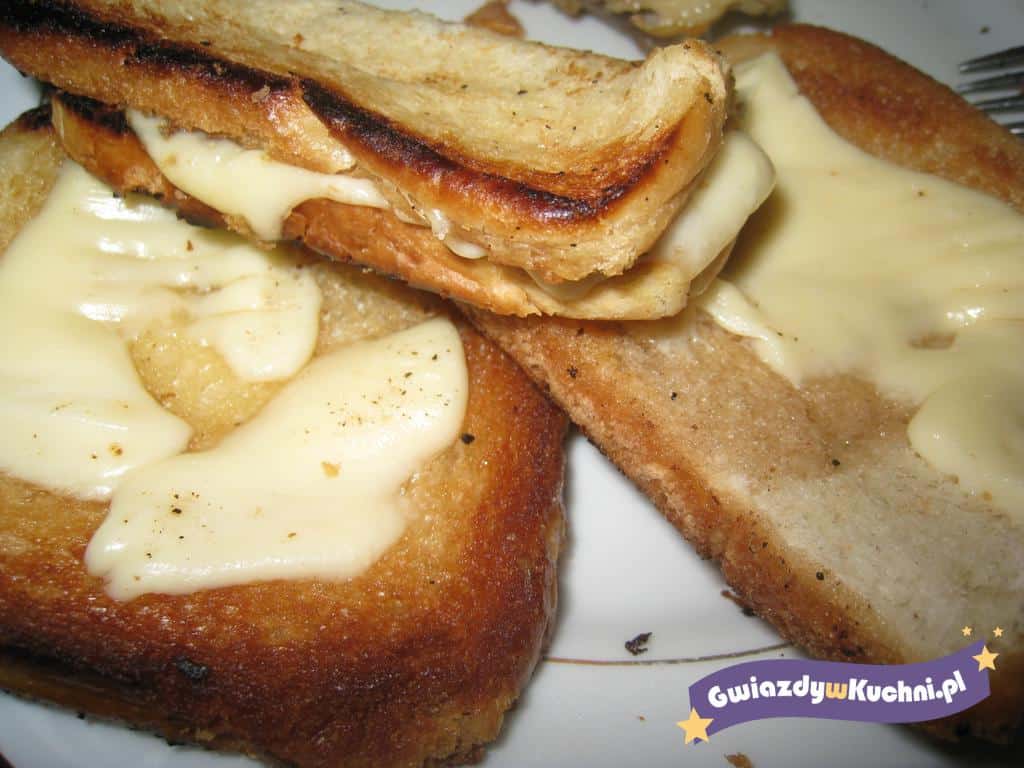 Chleb kroimy na kromki, kładziemy na rozgrzanym maśle na patelni i smażymy , przekręcamy na drugą stronę, kładziemy plasterek sera i przykrywamy patelnię przykrywką aby ser lekko się rozpuścił.