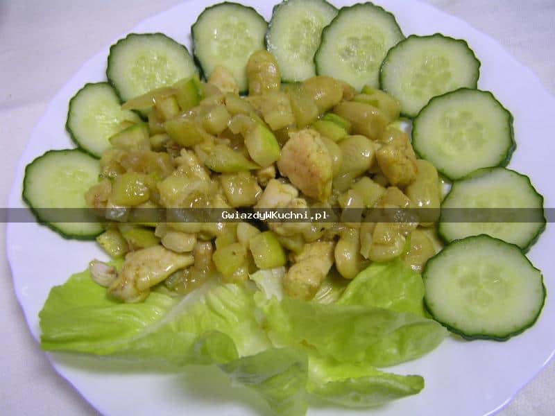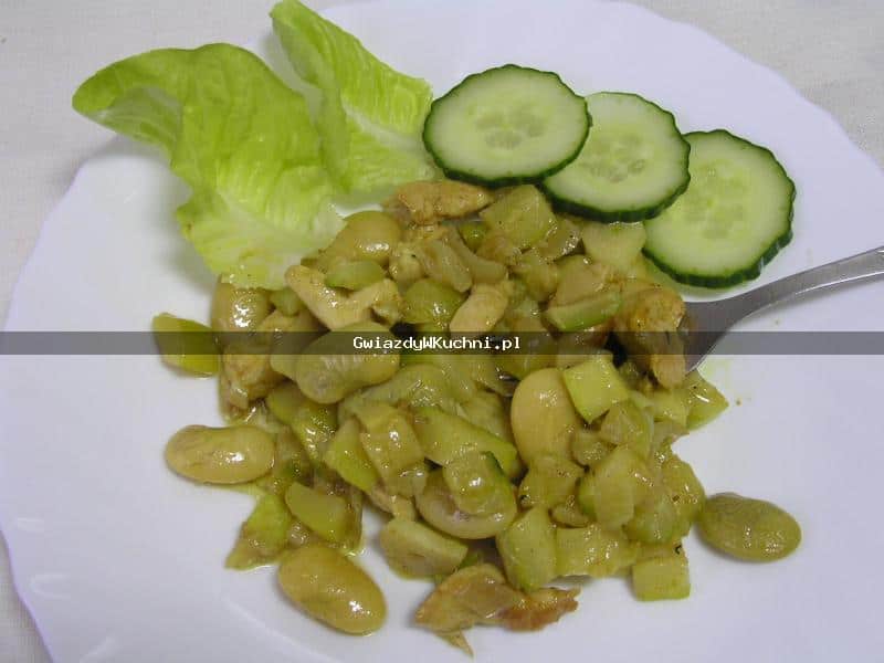 Fasolę ugotować, może też być z puszki. Pierś z kurczaka pociąć w kostkę, poddusić na patelni, dodając sól, pieprz, curry, cebulę, czosnek i obraną cukinię, pocięte w kostkę. Na końcu wymieszać z fasolą. Podawać z sałatą i ogórkiem.