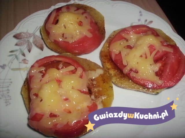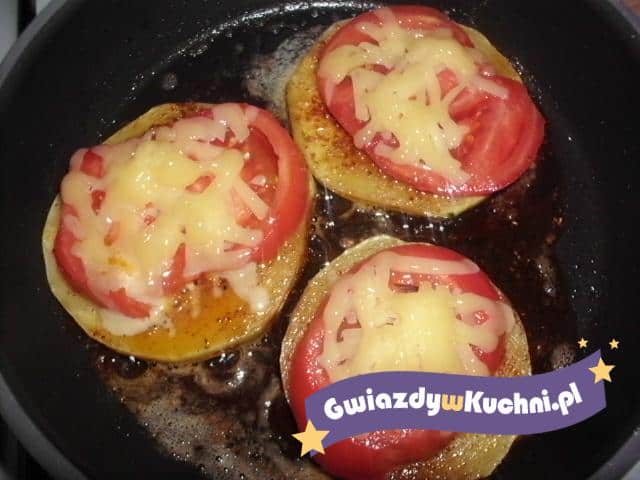Cukinię dokładnie myjemy i – jeśli ma twardą skórkę – obieramy a następnie kroimy w ok. 1,5 cm plasterki. Bułkę tartą mieszamy z solą, pieprzem i mieloną papryką. W powstałej mieszance panierujemy plasterki cukinii i smażymy na rozgrzanym tłuszczu. Gdy cukinia zrumieni się z jednej strony przewracamy ją a na opieczonej stronie układamy plaster obranego ze skórki pomidora i posypujemy startym żółtym serem. Nakrywamy przykrywką do czasu aż cukinia opiecze się i ser się roztopi.