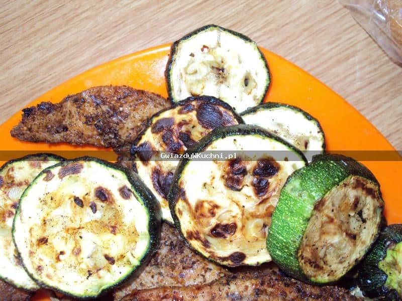 Cukinie myjemy i kroimy na grubsze krążki, solimy i kładziemy na grillu rozgrzanym. Pieczemy 12 minut.