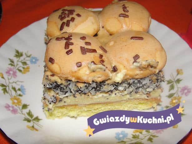 Na upieczone i zimne ciasto nałożyć krem karpatkowy (zrobić go jak pisze na opakowaniu).