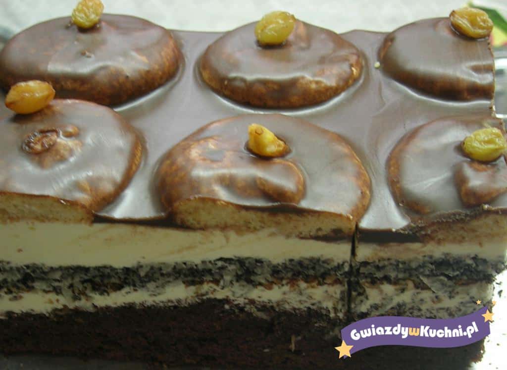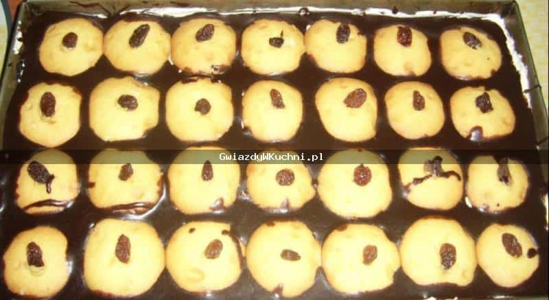 Biszkopty namoczyć w ponczu (zamiast alkoholu można użyć cytryny)i układać na kremie, na każdym biszkopciku położyć rodzynek i zalać polewą czekoladową.